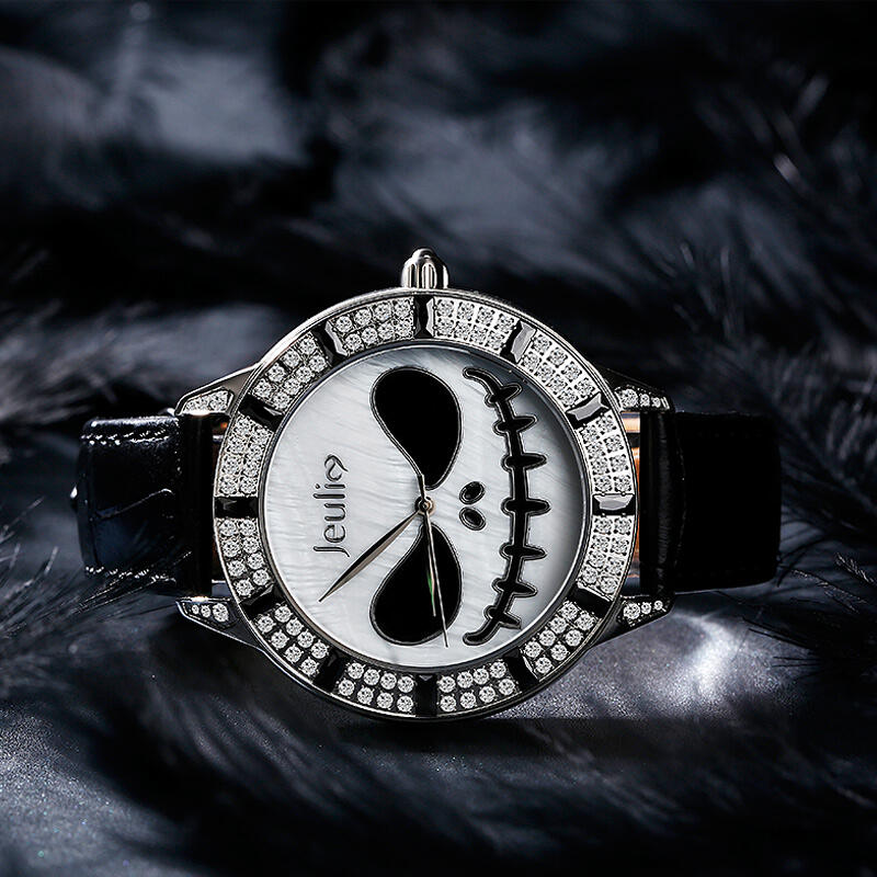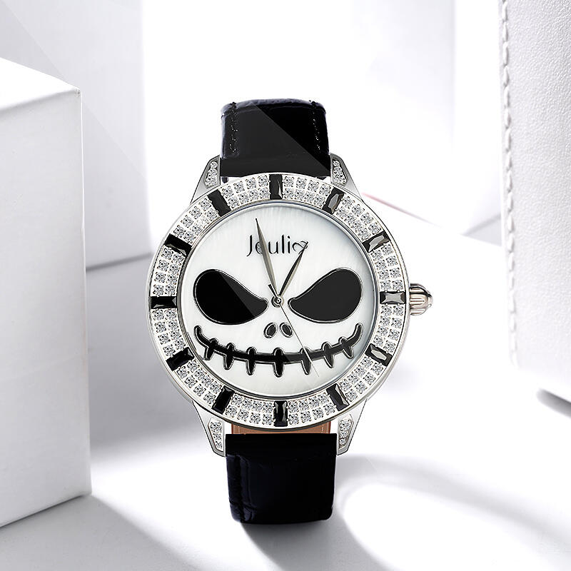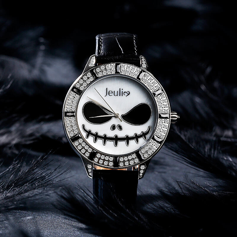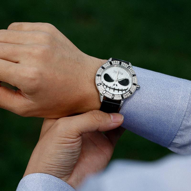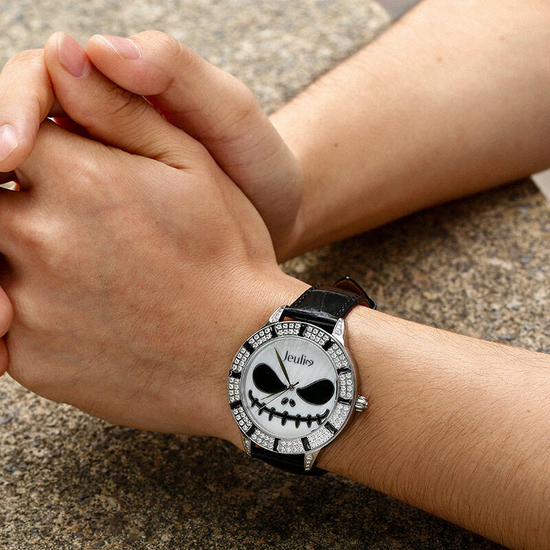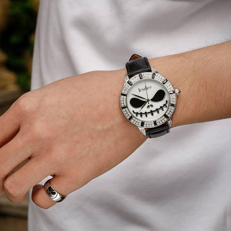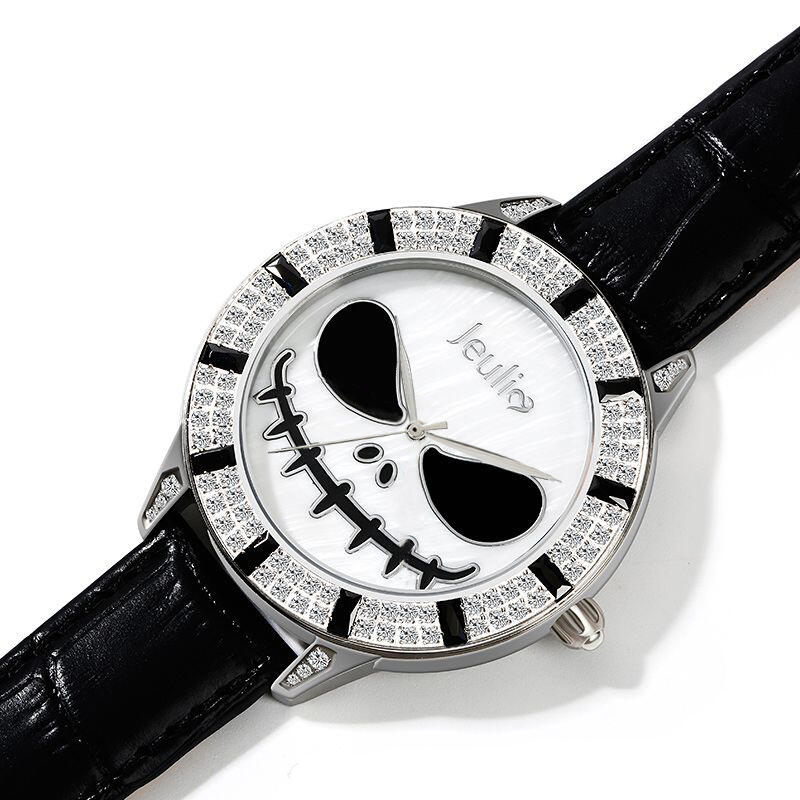 Jeulia "King of Halloween Town" Reloj De Cuarzo Con Correa De Cuero Negro Y Diseño De Calavera Con Esfera De Nácar