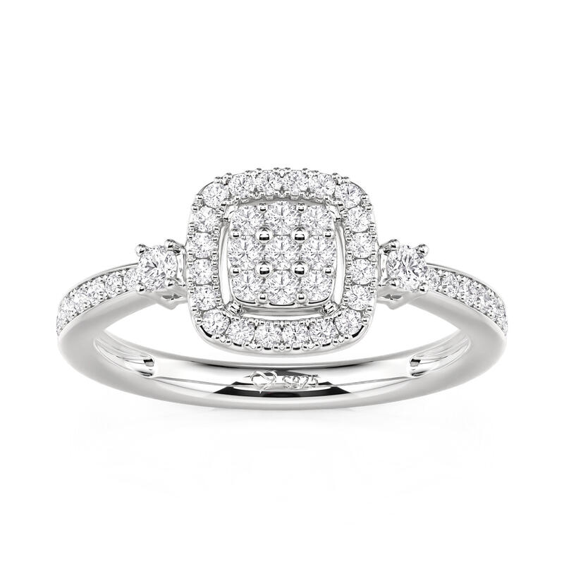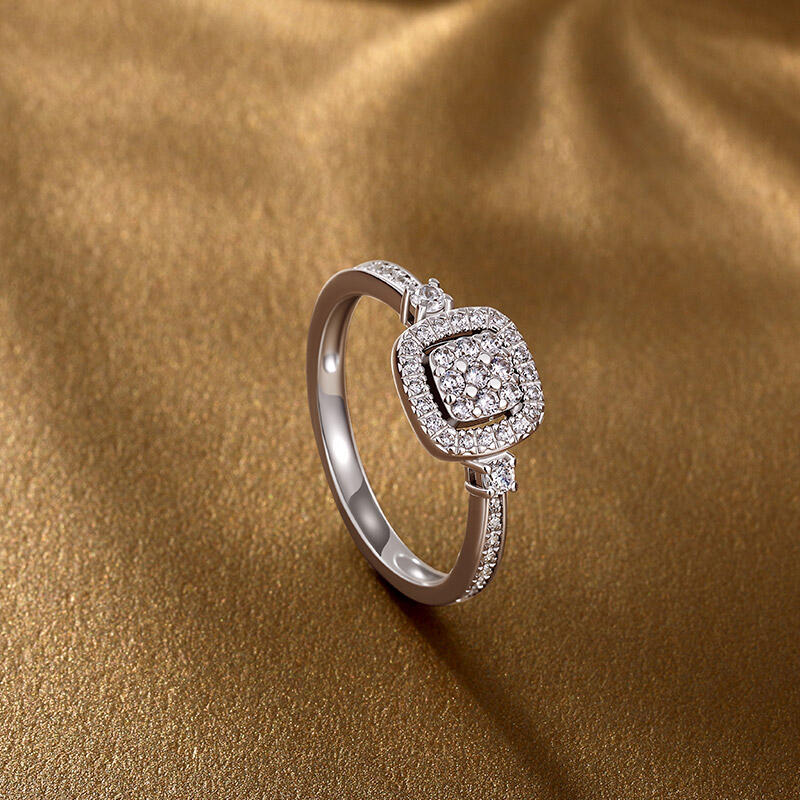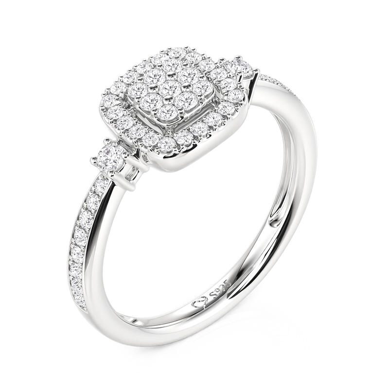 El Anillo de Compromiso Cuadrado de Tres Piedras Halo Minimalista Jeulia presenta una disposición impresionante donde el centro está compuesto por múltiples piedras más pequeñas que crean una apariencia cuadrada en lugar de una sola piedra grande Este diseño no solo realza el brillo del anillo de halo sino que también agrega un efecto de capas único perfecto para quien aprecia la elegancia moderna El halo de piedras más pequeñas que rodea la pieza central agrega destello extra simbolizando la belleza de su historia de amor Su estética minimalista hace que este anillo de tres piedras sea una elección atemporal para cualquier compromiso