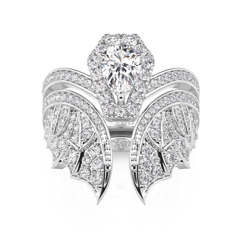 Este exclusivo conjunto de anillos de compromiso de Jeulia en forma de ataúd con murciélagos está elaborado en plata de ley 925, reinterpretando los votos eternos de amor a través de una audaz estética gótica. El anillo principal presenta un innovador engaste en forma de ataúd, con una piedra central en forma de pera y piedras redondas de acento dispuestas meticulosamente para formar una misteriosa silueta de ataúd. Los laterales de la banda se extienden en alas de murciélago talladas con intrincado detalle; el anillo secundario continúa con el tema de las alas de murciélago en un diseño abierto, creando un estilo envolvente. Este conjunto de anillos de ataúd no tradicional es perfecto para parejas que buscan una expresión única de su amor, ya sea para una boda de temática gótica, una propuesta en Halloween o simplemente para mostrar su individualidad en la vida cotidiana.